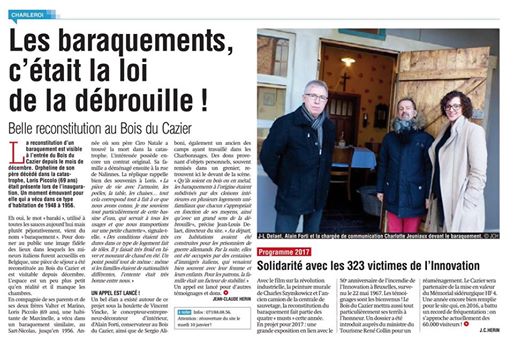 A lire dans La Nouvelle Gazette Charleroi du jour: un article consacré à la reconstitution du baraquement ouvrier. A visiter au Bois du Cazier dès ce lundi."Avec le film de Dirty Monitor sur la Révolution Industrielle, la fresque de Charles Szymkowicz et l'ancien camion de la centrale de sauvetage, la